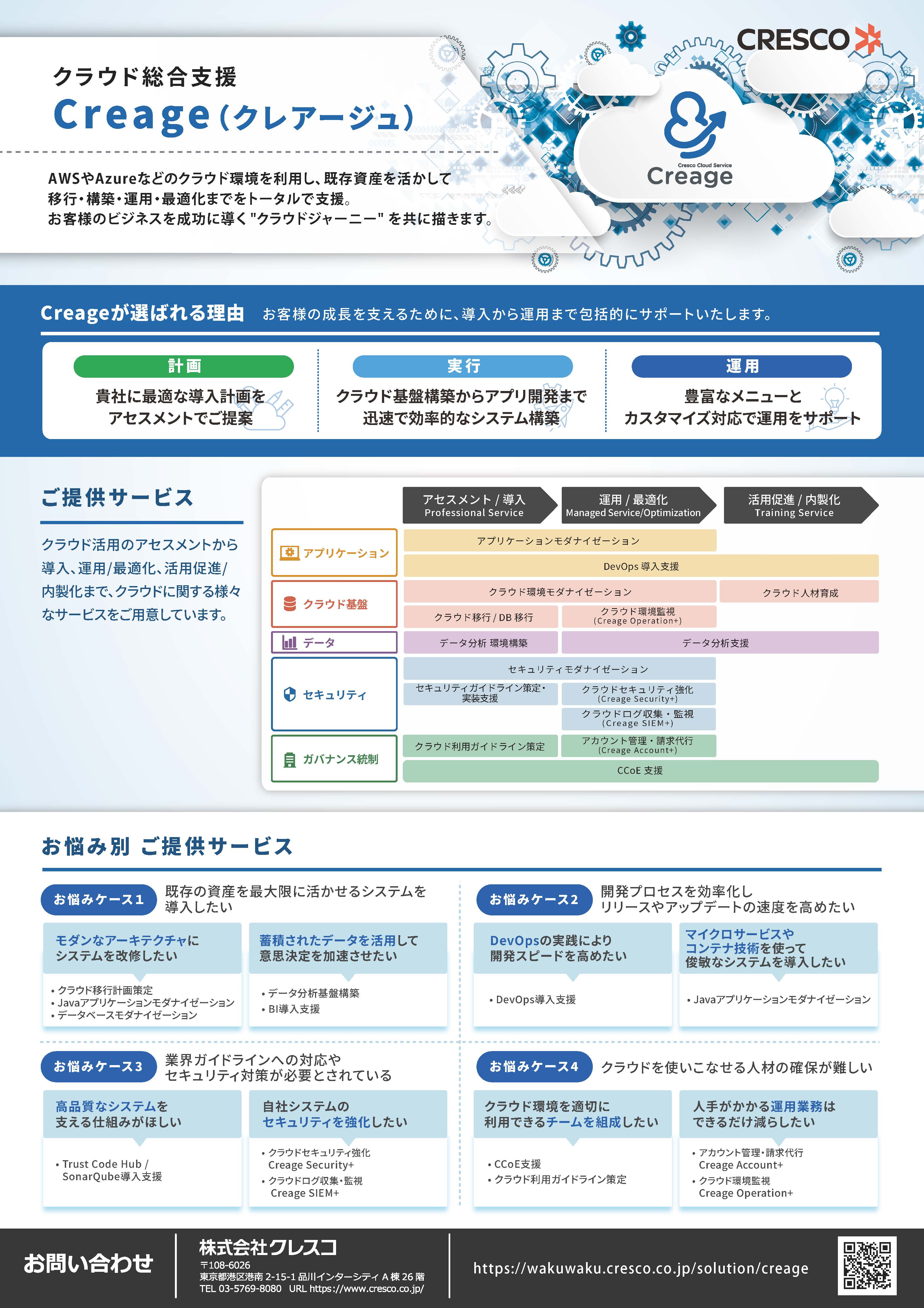 Creage Operation+は AWS / Azure クラウド向けの運用管理サービスです。30年超のエンタープライズシステム構築・運用におけるノウハウを活用し、クラウドに最適化された運用管理サービスをご提供します。