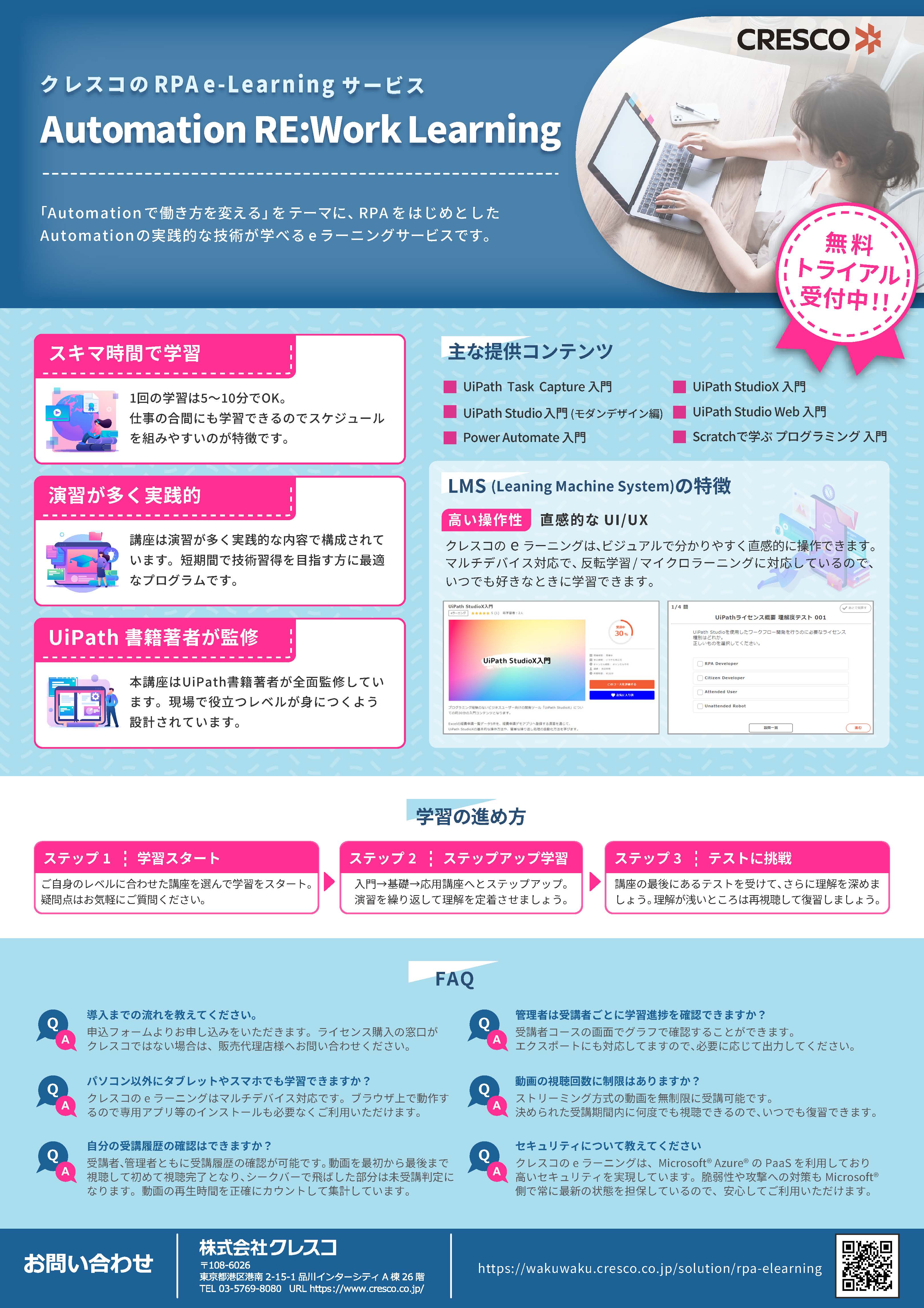 RPAをはじめとしたAutomationの実践的な技術が学べるクレスコのeラーニングサービスです。 |